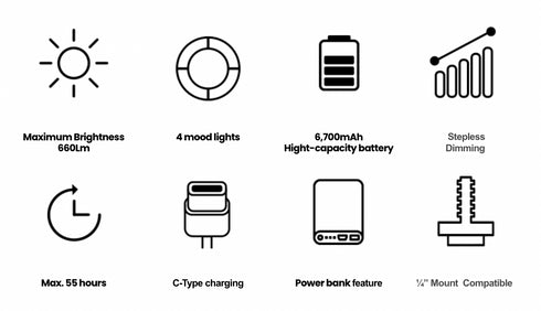 Claymore Lamp Selene 是一款便攜式野營燈。最大亮度為 660 流明,您可以根據個人喜好和品味在 4 種燈光氛圍中進行選擇。6700mAh大容量電池可用於多種室內外空間,具有出色的亮度控制功能。最長可使用55小時,使用Type-C充電方式隨時隨地輕鬆充電。