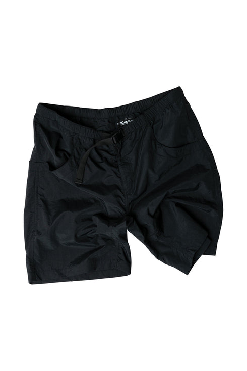 這是一款鬆身、腰圍有彈性的短褲,有橡膠按扣和拉鍊開襠,內置一條3/4英寸的尼龍網帶,使用YKK中心釋放扣環。前面的口袋經過加固,右後口袋內部有一個固定錢包的帶子。口袋裡是網狀結構,襠部設計有活動空間,縫線採用雙針加固。