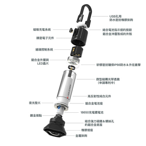 - 多種照明模式:包括高功率/低功率/增強/閃爍/脈衝/ S.O.S /頻閃