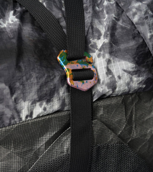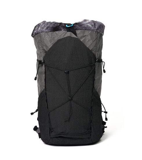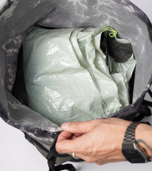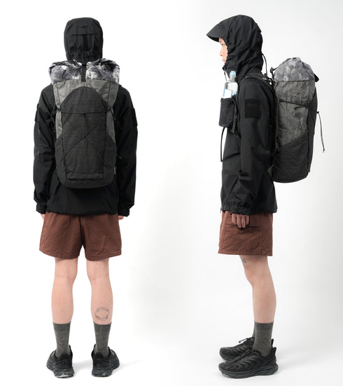 RB36頂部採用束口捲蓋設計,並且配上具有10000mmH2O抗水壓的尼龍扎染面料,呈現出不規則的飛白紋理,讓每一顆包包都具有獨一無二的花色。