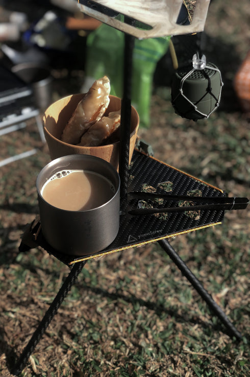 呢塊檯板除左可以放置物品之外,亦用上繩材去令檯板有多一個功能,就係拿黎掛你嘅工具。⚠️配合YS-02 Carbon Multi-Purpose Caribiner , 仲可以有多千千萬萬種挽法。